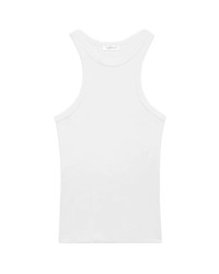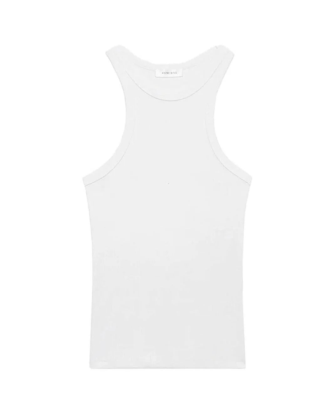 The Eva Tank in White by Anine Bing is a fitted ribbed knit tank crafted in a cotton-spandex blend finished with a high crew neckline for a clean look. - Cut for a close fit that's long enough to tuck and layer. Take your true size. - 95% Organic Cotton, 5% Spandex.