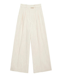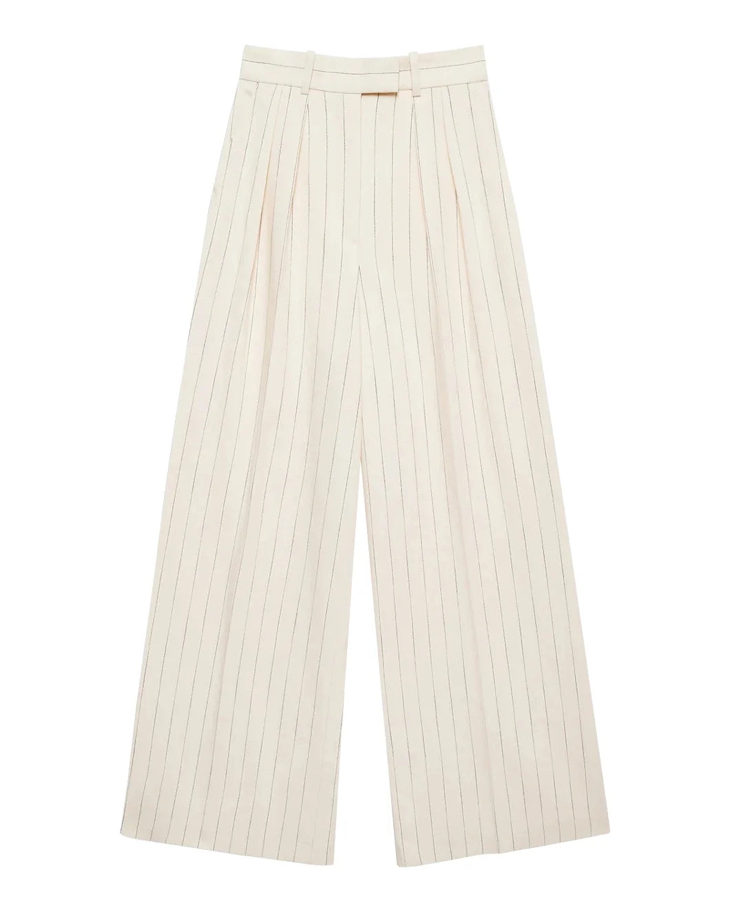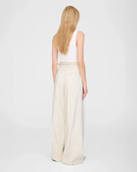 The Lou Trouser in Cream and Black Stripe by Anine Bing is a wide leg trouser featuring a high rise, double pleat detailing, crafted in a breathable viscose blend with a slight sheen and striped pattern. - Fully lined - Extended tab and zip-front closure - Dropped crotch - Full-length inseam - One back welt pocket - A-03-10863-MTL66 - Product Measurements (Size 36/6): Inseam: 32", Rise: 15.5", Waist: 28", Hip: 47", Leg Opening: 28.8" - 91% Viscose, 8% Polyester, 1% Elastane - Dry clean - Made in Portugal