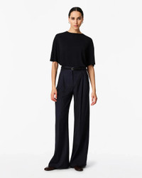 The Twill Pleated Trouser in Navy and Chalk by Another Tomorrow is crafted in a midweight wool twill with a wide leg sitting at the natural waist, featuring precise pleats, welt pockets, self-covered buttons, and a zipper fly. Their family-run farm partners across Australia, New Zealand, and Uruguay compassionately raise and shear their sheep in exemplary conditions, free of the cruel practice of mulesing. - 99% Wool, 1% Polyester (Navy/Chalk) - Made in Italy - Unlined - Sits high waisted - Double pleats at front - Wide leg - Front fly with hook and bar + zipper closure - Back welt pockets with self covered buttons - 83cm inseam - Dry clean sparingly - Model is 5’10” and wears a size 40. - Runs true to size.