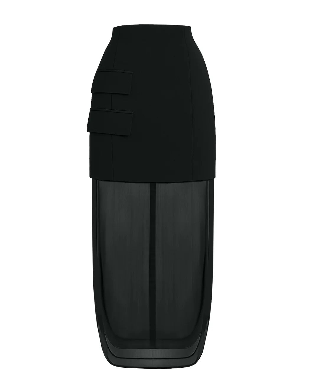 The Basque Skirt with Organza Layer by A.W.A.K.E. Mode is a tailored skirt featuring a sheer cotton organza layer. - Concealed zip fastening - 98% Virgin Wool, 2% Elastane - Fabric 2: 100% Cotton - Dry clean