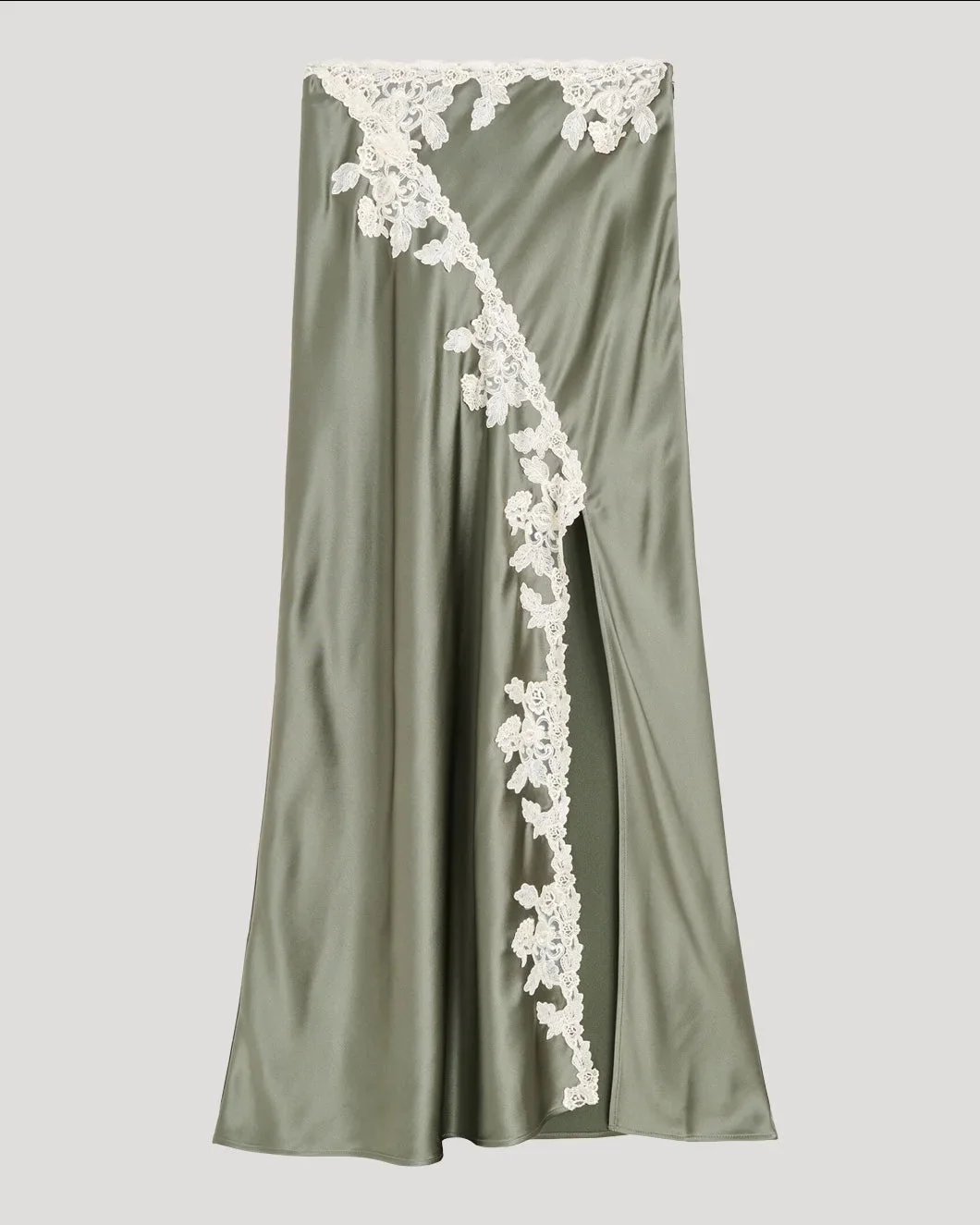 The Erica Maxi Skirt in Lichen Green by By Malene Birger is a romantic, maxi skirt featuring a lace trim and front slit crafted in a luxe satin. Model is 177 cm and is wearing a size 36 - Material: 76% Acetate, 24% Polyester - Eastman Naia™ acetate is a cellulosic fibre produced from responsibly sourced wood pulp. It is quick drying, supremely soft and comfortable to wear. - Details: Zip and hook closure - Fit: Regular fit - Style it with: a minimalist t-shirt or knit tank - Style #: 1037684G1