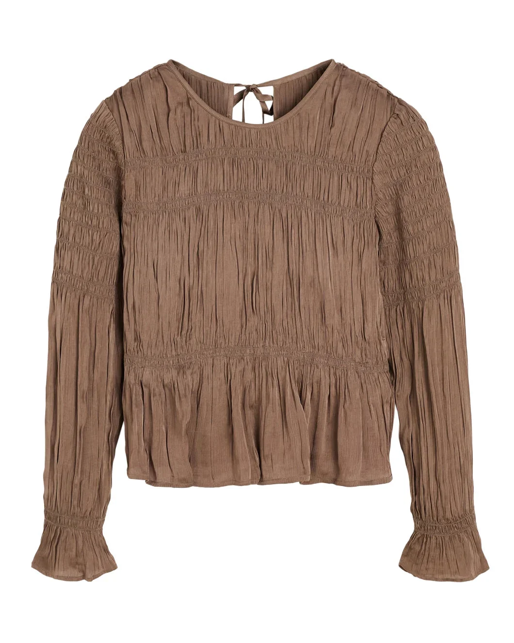 The Ovas Blouse in Chocolate Chip by By Malene Birger is a feminine blouse crafted in a smocked fabrication with a low back tie closure and elongated sleeves. - Model is wearing a size 36 - 100% Viscose Contains LENZING™ ECOVERO™ viscose fibers - "LENZING™ and ECOVERO™ are trademarks of Lenzing AG - #10370511A - Unlined