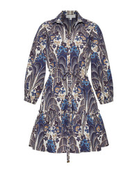 The Robin Dress in Fontaine Egret by Cara Cara is a long sleeve patterned dress that falls right above the knee. This dress features a tent dress silhouette with a self-tie cinch waist and a ruffle tier skirt. Perfect for a day out or vacation lunch. - Material: 100% Cotton Poplin - Details: Collared neckline. Drawstring waistband. Puffed sleeves. Unlined. - Fit: Sized for an easy fit. - Style it with: statement jewelry and heels or sneakers. - Dry Clean Only or Hand Wash Cold - Made in India - #180 - Length, Chest, Waist extended (in.) • XS: 35.75, 41, 25 • S: 36, 42.5, 25.5 • M: 36.25, 44, 26 • L: 36.5, 45.5, 27