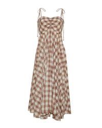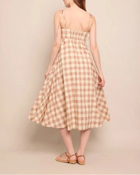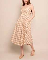 The Sunray Dress in Sketched Plaid Brown by Cara Cara is a sweet heart, midi dress featuring a circle skirt, ruched bodice, and spaghetti strap ties with gold beads. - Elasticated smocking panel at the back - Center back zipper with hook-and-eye closure - Side seam pockets - Fully lined - Boning at side seams - 100% Cotton - Dry clean only or Hand wash cold - Made in China