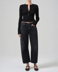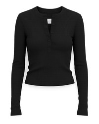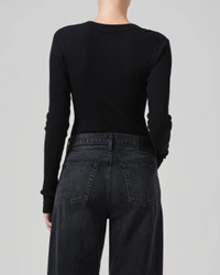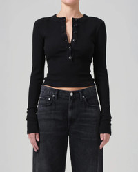 The Varra Henley in Black by Citizens of Humanity is a classic rib knit henley crafted in an ultra-soft organic cotton with supportive stretch. - 49% Organic Cotton 49% Tencel Lyocell 2% Spandex - Body Length: 21 1/2" Shoulder to Shoulder: 13" Sleeve Length: 24 1/2" - Made in USA - 9400-30304