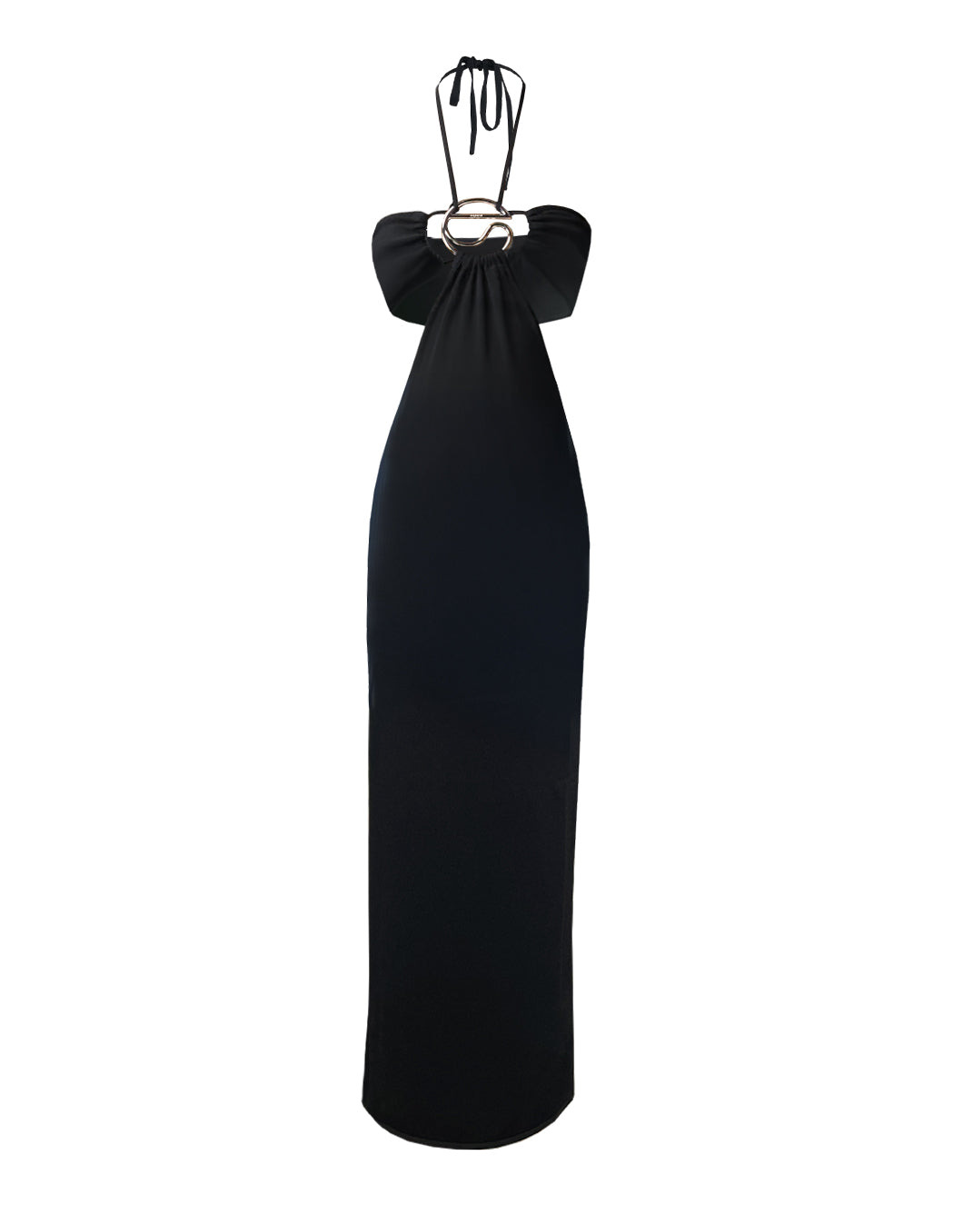 FINAL SALE The Knitted Halter Dress in Black by Coperni is a chic maxi dress that features a halter neck tie, compelling cut outs, and a silver-toned jewelry brooch detail. - 100% Viscose - Made in Italy - Runs small in the bust - COPML1345Y3010