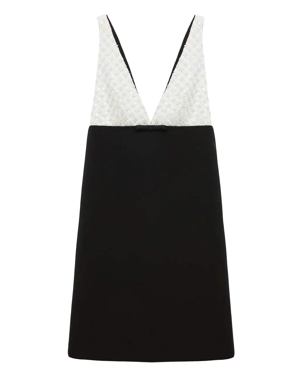 The Emotional Essence Dress in Black and Off White by Dorothee Schumacher is a sequin embellished dress featuring a two-tone fabrication with floral sequin at the top, deep v-neckline, and small bow detail. Perfect for holiday parties.