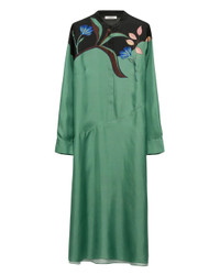 The Seductive Bloom Dress in Organic Cotton in the color Autumn Green by Dorothee Schumacher is a long sleeve, mid-length shirtdress that features a wrap around collar with a removable tie, a slight asymmetrical hem, and perfectly placed floral print. The perfect day dress for a casual outing. **This item is finished according to OEKO-TEX® STANDARD 100, 22.0.98928 Hohenstein - Material : 100% Silk - Details: Removable tie. - Fit: Loosely fitted mid section with fitted shoulders. - Style it with: A clutch and black heel for an elevated look. - #253/249104/057