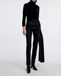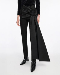 The Shiny Moment Pants in Cotton Blend in the color Black by Dorothee Schumacher is a skinny jean pant that features a dramatic satin bow that loosely drapes over one leg with a slim fit. Your perfect evening pant for an elevated dinner party. - Material: 94 % Cotton, 5 % Polyester, 1 % Elastane - Details: Form Fitting. In-seam side zip. - Fit: The model is 179cm tall and wears a size small (2). - Style it with: A blouse and heel. - Care: Hand wash cold / Machine wash old. #253/246803/999