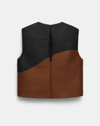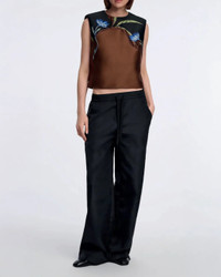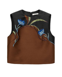 The Soft Petal Top in Carmel Black by Dorothee Schumacher features a relaxed, loose fit with a sleeveless silhouette. Crafted from cloque jacquard fabric, this top showcases a floral print patchwork design and subtle shoulder padding for a polished, seamless look. - Material: 68% Acetate, 32% Polyester - Details: Cloque jacquard shell, floral patchwork print, round collar, subtle shoulder padding - Fit: Loose fitted sleeveless top - Style it with: The coordinating Soft Petal Skirt for a chic, head-to-toe ensemble. - Where to wear it: Perfect for daytime events, casual workdays, or elegant weekend outings. - Style #: 253_246606_079