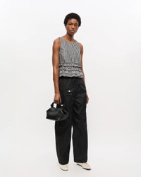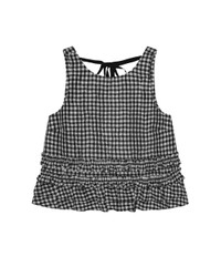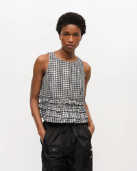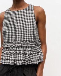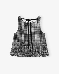 FINAL SALE The Crinkled Check Frill Top in Black by Ganni is an open back, frill trim top crafted in a white checked, crinkled fabrication. - 100% Recycled Polyester - Made in Turkey