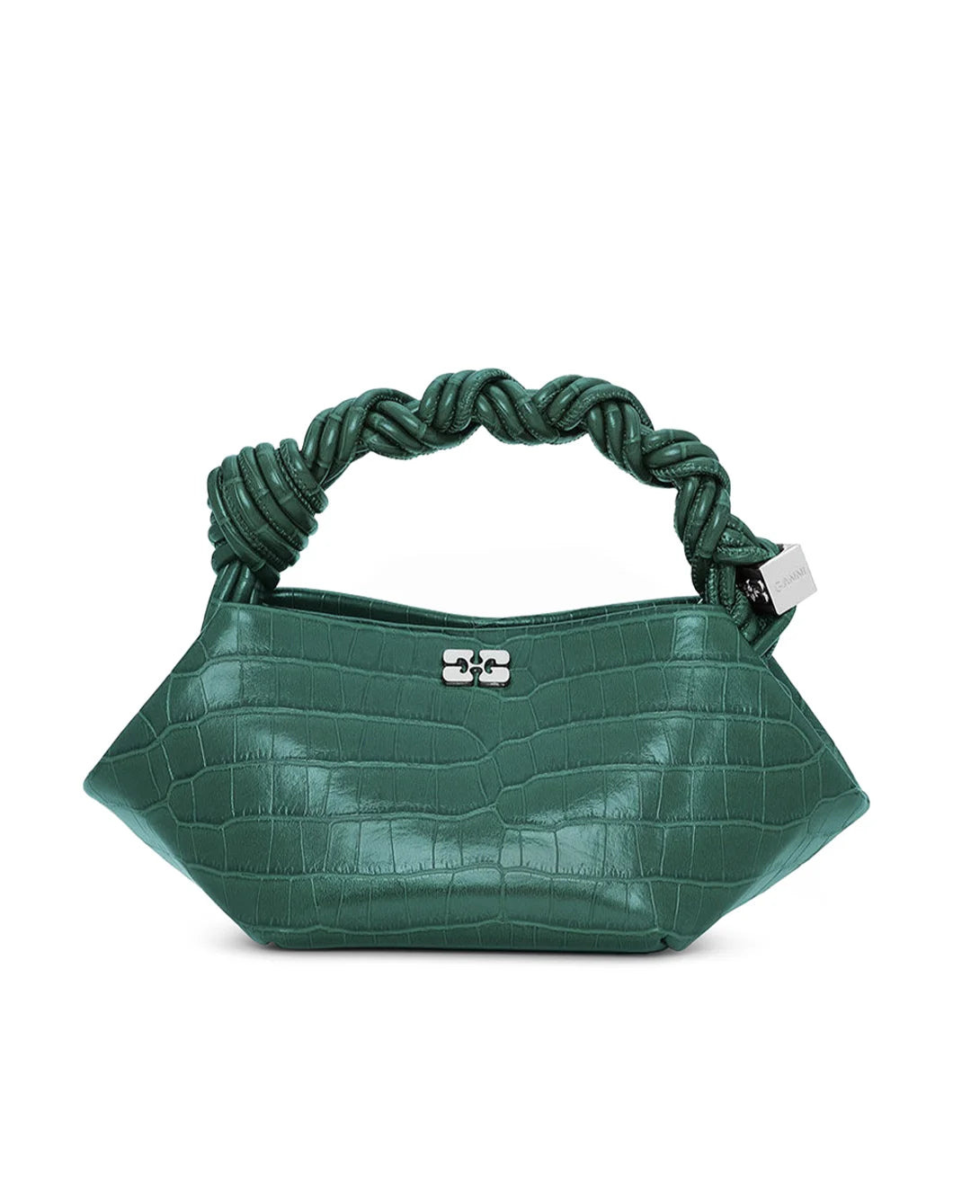 The Green Croco Patent Mini GANNI Bou Bag by Ganni is a striking purse featuring a twisted handle with a braided knot, silver-tone metallic dice with a Ganni butterfly logo, and a removable strap for crossbody wear. Perfect for evening occasion-wear. - Material: 5 1% recycled leather, 23% TENCEL™ Lyocell, 26% polyurethane - Lining: 65% Recycled Cotton 35% Cotton - Details: Internal magnetic closure, flat card pocket inside. - Pair back to a little black dress for an evening on the town. - Measurements: Strap length: 50 cm Height: 11 cm Width: 25 cm Depth: 11.5 cm Designed to hold an iPhone 15, cardholder, keys, lipstick - Made in China - Style: A6748