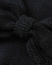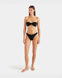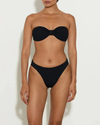 The Jean Bikini in Black by Hunza G is a strapless, knot front swimsuit with classic coverage briefs and light bust support crafted in their signature crinkle fabrication.