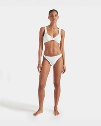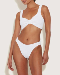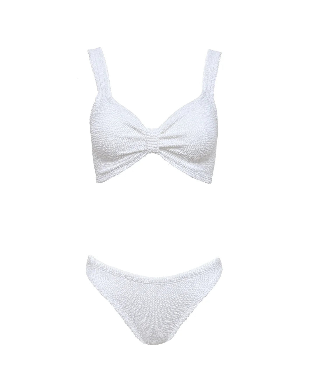 The Bonnie Bikini in White by Hunza G is a retro inspired bikini featuring a top with gathered bow-effect and bottoms with a deeper waist. - Hunza G's Original Crinkle™fabrication stretches to flex, sculpt, and support every curve, adapting to all body types in a unique one-size-fit to provide confidence and style for every body. The one-size design offers a custom-like fit for UK 6-16 (US 2-12). Hunza G swimwear returns to its original shape after every wear, making it a timeless choice for your swim collection – made for whatever life brings.