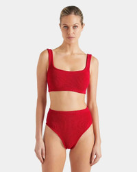 The Patricia Bikini in Red by Hunza G is a bikini featuring a square neck top and high-waisted bottom crafted in a crinkle fabrication. - Hunza G's Original Crinkle™fabrication stretches to flex, sculpt, and support every curve, adapting to all body types in a unique one-size-fit to provide confidence and style for every body. The one-size design offers a custom-like fit for UK 6-16 (US 2-12). Hunza G swimwear returns to its original shape after every wear, making it a timeless choice for your swim collection – made for whatever life brings.