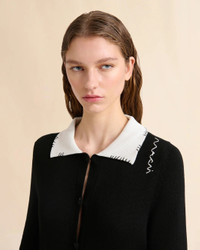 The Black Cotton Cardigan with Marni Mending by Marni is a long-sleeve cardigan featuring a contrasting stitch detail and contrast collar crafted in a stockinette cotton knit. - 100% Cotton - Hand-stitched Marni Symbol on the shoulder - Regular fit with full button closure