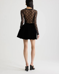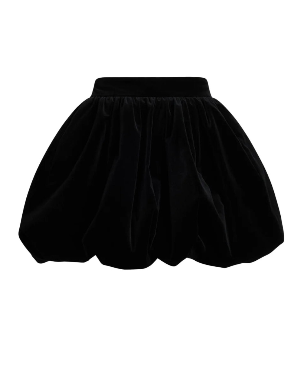 The Bloomer-Effect Mini Skirt in Organic Cotton Velvet in Black by Patou is mini bubble skirt featuring a bloomer effect hem, viscose lining and a zipper closure. Perfect for an evening dinner, a special occasion and perfectly paired with the matching Scarf Top.
