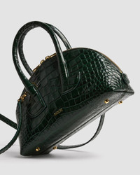 The Le Patou Bowling Bag in Crocodile-Embossed Leather in Garden Green by Patou is a bowling shape, two top handle bag featuring geometric cut-out details, tw o-way gold-tone top zip fastening, and removable shoulder strap. Perfect for an after-work dinner.