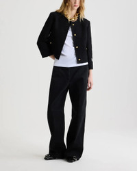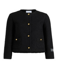The No Collar Box Jacket in Black by Patou is a wool-blend, tweed jacket featuring a collarless silhouette, gold buttons, and shoulder pads. Perfect for elevating a simple look with jeans or trousers. - Material: 96% wool, 4% polyamide - Made in Romania - Lining: 100% viscose - Trim: 100% polyester - Made in Romania