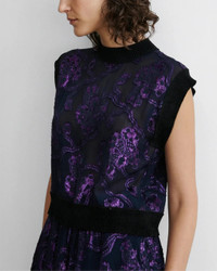 The Orin Top in Midnight Purple Moonlace Jacquard by Rachel Comey is a sleeveless top crafted from a sheer knit with a sequin floral pattern featuring a crew neckline with rib trim. - Pullover style - 80% Viscose, 20% Lurex - Made in USA - 261W-325-S1888 - Hand wash Lay flat to dry Iron on low Dry clean recommended