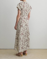 The Steady Dress in Organic Cotton in Cream by Rachel Comey is a midi dress that features an asymmetrical hem, cap sleeves and modern print. A perfect fall transition piece.