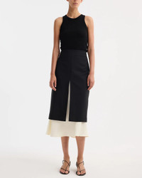 The Contrast Upside-Down Skirt in Wool Blend in the color Black by Rohe is a layered midi skirt that features a front slit, flowing contrast under layer, and a form-fitting silhouette. Your perfect pencil skirt with a twist. - Material: 73% Virgin Wool, 27% Wool Mohair - Details: Fitted. - Fit: The model is 179cm and is wearing a size 4 (FR 36). - Style it with: A tank or tucked in button up for a tailored look..