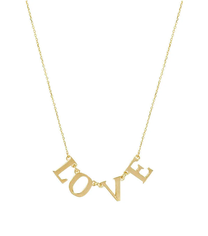 FINAL SALE The Love Necklace by Roxanne First is a delicate gold chain featuring charms spelling out LOVE. Great for layering with Graduated Rainbow Sapphire Beaded Necklace. - 9ct gold (baby, solid gold) - Total chain length - 17", adjustable at 16"