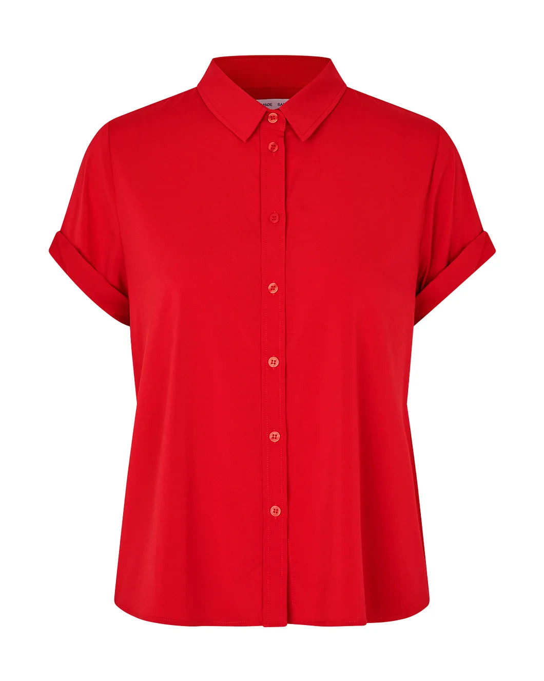 The Majan Shirt in Viscose in the color Haute Red by Samsoe Samsoe is a short-sleeve button up that features a collared neckline, back center pleats and rolled hem sleeves. This product contains LENZING™ ECOVERO™ Viscose, certified with the EU Ecolabel for meeting high environmental standards.