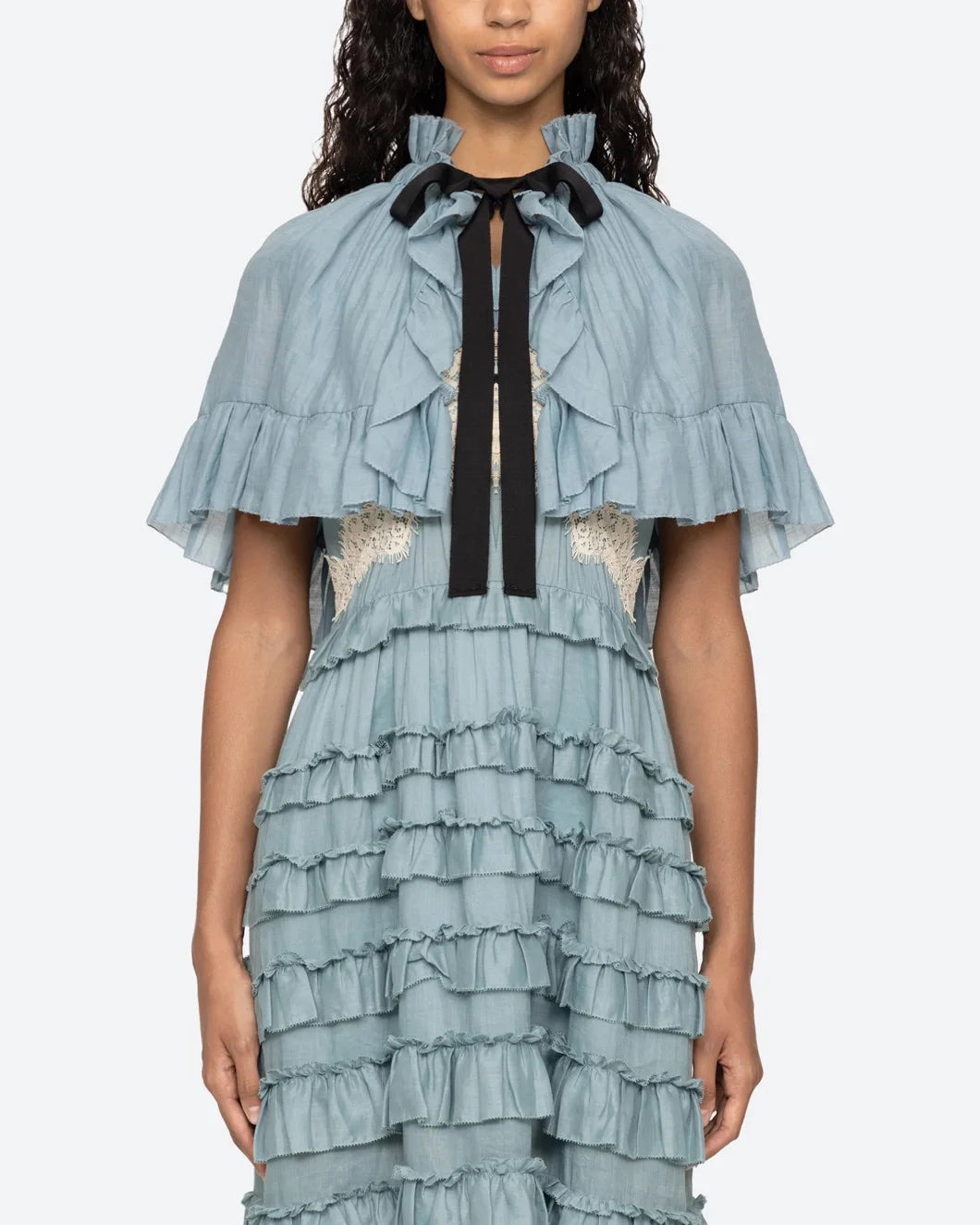 The Anise Cape in Blue by Sea New York is a versatile layering peace featuring a delicate front tie closure and ruffles around the neckline and hem for a sophisticated look. Perfect for layering over dresses and tanks. - Material: 100% Ramie - Details: Tie front closure, ruffled hem, contrast bow - Style it with the matching Sea NY Anise Dress for a coordinated look - #AW25-004