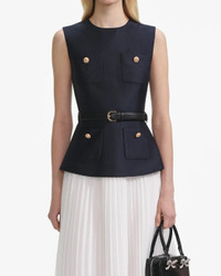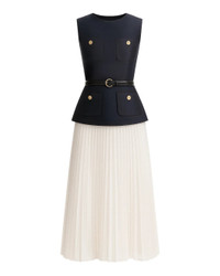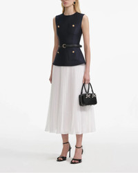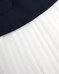 The Navy Taffeta Midi Dress in Blue by Self-Portrait is a tailored midi dress featuring a white chiffon skirt, belted waist, and gold buttons. - 100% Polyester - Fitted style - This style has minimal stretch - Zip closure at back of top - Zip closure at waist - Removable belt - #PF25-017MA-BL