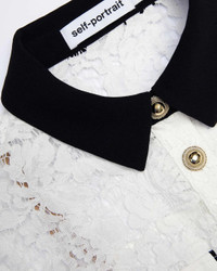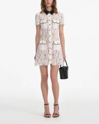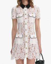 The White Lace Contrast Collar Mini Dress in White by Self-Portrait is a short sleeve, button-front mini dress featuring a contrast collar and gold buttons, crafted in delicate lace. - Fitted style - This style has minimal stretch - Detachable cami lining - Functional pockets - Main Fabric: 70% Polyamide 30% Cotton - Trim Fabric: 100% Polyester Exclusive Of Trimmings - Detachable Lining: 100% Polyester - #PF25-020S-W