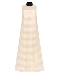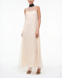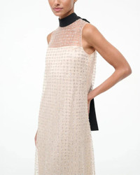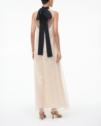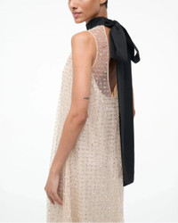 The Albee Dress in the color Stardust by Staud is a sleeveless maxi dress that features sheer embellished tulle, a high neck with a functional tie in the back and an interior slip. Perfect for your next holiday party. - Materials: S elf: 100% Polyester Lining: 100% Polyester Core: 60% Cotton 40% Polyester - Details: High neckline - Fit: True to size - Sizing: Model is 5'10" and wearing a size Small - Style it with: A black pointed toe heel and clutch - Care: Dry clean only.