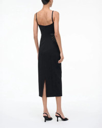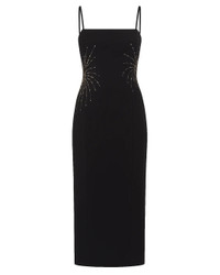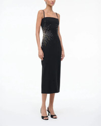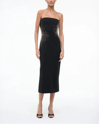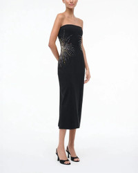 The Britney Dress Firework in the color Black by Staud is a fitted column midi dress that features a strapless neckline, optional straps and firework beading at the waistline. Perfect for your next holiday party. - Material: Face: 100% Seed Beads Self: 68% Rayon, 27% Nylon, 5% Elastane Lining: 80% Nylon, 20% Elastane - Details: Removable straps - Fit: True to size - Sizing: Model is 5'10" and wearing a size Small - Style it with: A black heel and handbag - Care: Dry clean only.