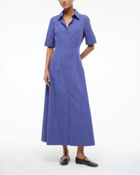 The Joan Dress in Atlas Stripe by Staud is a short sleeve, maxi shirtdress crafted in a multi colored striped cotton poplin. - Runs small, size up one size. - 98% Cotton 2% Spandex - R25P2280YP - Dry clean only - Model is 5'10 and wearing a size 4