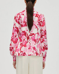 Blouse in a crisp organic cotton blend with an all-over pink floral print. Designed with long sleeves and buttoned cuffs, a structured turtleneck with delicate ruching at the front, and a button closure at the back. 60% Organic Cotton/28% Viscose/12% Linen Machine wash SG-AW25-T110-2438