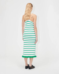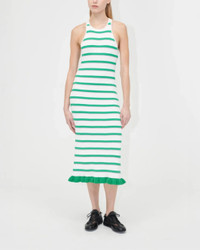 The Ruffle Tank Dress in Green and Pink Stripes by Stine Goya is a striped midi length knit dress with a green ruffle hem, featuring a racerback design and a fitted silhouette.