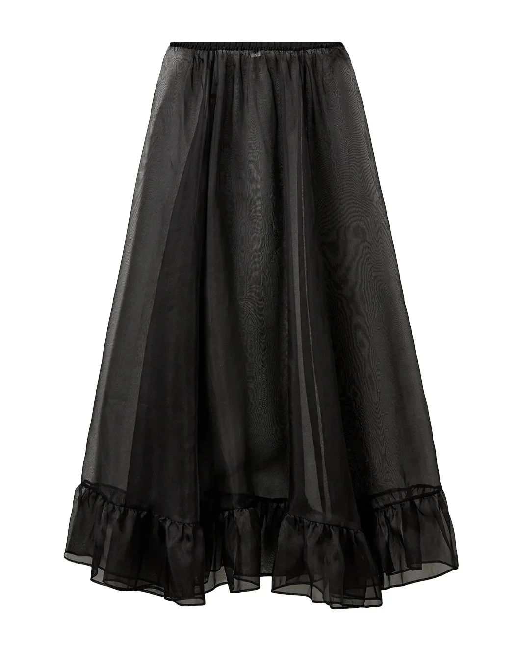 The Vivaldi Skirt in Black by The Garment is a full length maxie skirtcrafted from 100% silk, featuring a ruffled hem, and delicate sheer silhouette with a fluid and lightweight drape. - 100% Silk - Model is 174 cm tall and wearing a size 8 - Dry clean - #21726