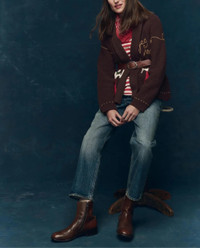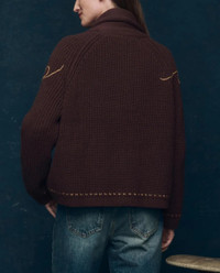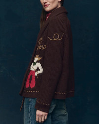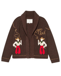 The Lasso Lodge Cardigan in Cotton Blend in the color Umber by The Great. is a long-sleeve, open front cardigan that features a hand-embroidered cowboy and lasso spelling out “yeehaw”- a playful detail inspired by a 1960’s children’s sweater, a thick fold over neckline, and spun from soft cotton blend yarn for a cozy, comfortable feel. Your perfect cardigan for fall. - Material: 60% Cotton, 40% Acrylic - Details: Open cardigan. - Fit: Take your true size. For a closer fit, we recommend sizing down. - Sizing: Model is 5'9" wearing a size S (SZ 1). - Style it with: A pair of denim or slip skirt. - Care: Dry Clean Only - Imported - #S534682