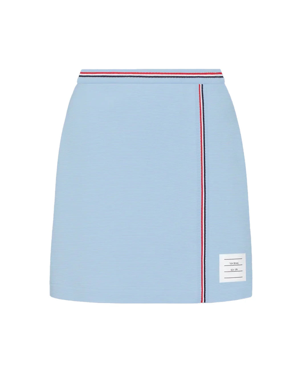 The Cotton Waffle Mini Wrap Skirt in Light Blue by Thom Browne is a classic wrap silhouette crafted in a lightweight cotton waffle with a contrast trim and nametag applique. - Signature striped grosgrain loop tab - Model is 5'10" (178 cm), wearing size 40 - 100% Cotton - Made in Italy - FJK141A-J0216-480