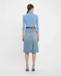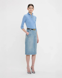 FINAL SALE The Denim Wrap Detail Skirt in Pale Blue Wash by Victoria Beckham is a knee length denim, wrap skirt featuring splits at the front and back, and contrast tobacco and red topstitch details. - Patch pockets - Enamel button and side seam zip closure - Branded leather patch on waistband - Fits true to size, take your regular size - The model height is 5'10''/179cm and is wearing a size 6 - 100% Cotton - Machine wash at 30C - Made In Italy - #1125DSK006000A