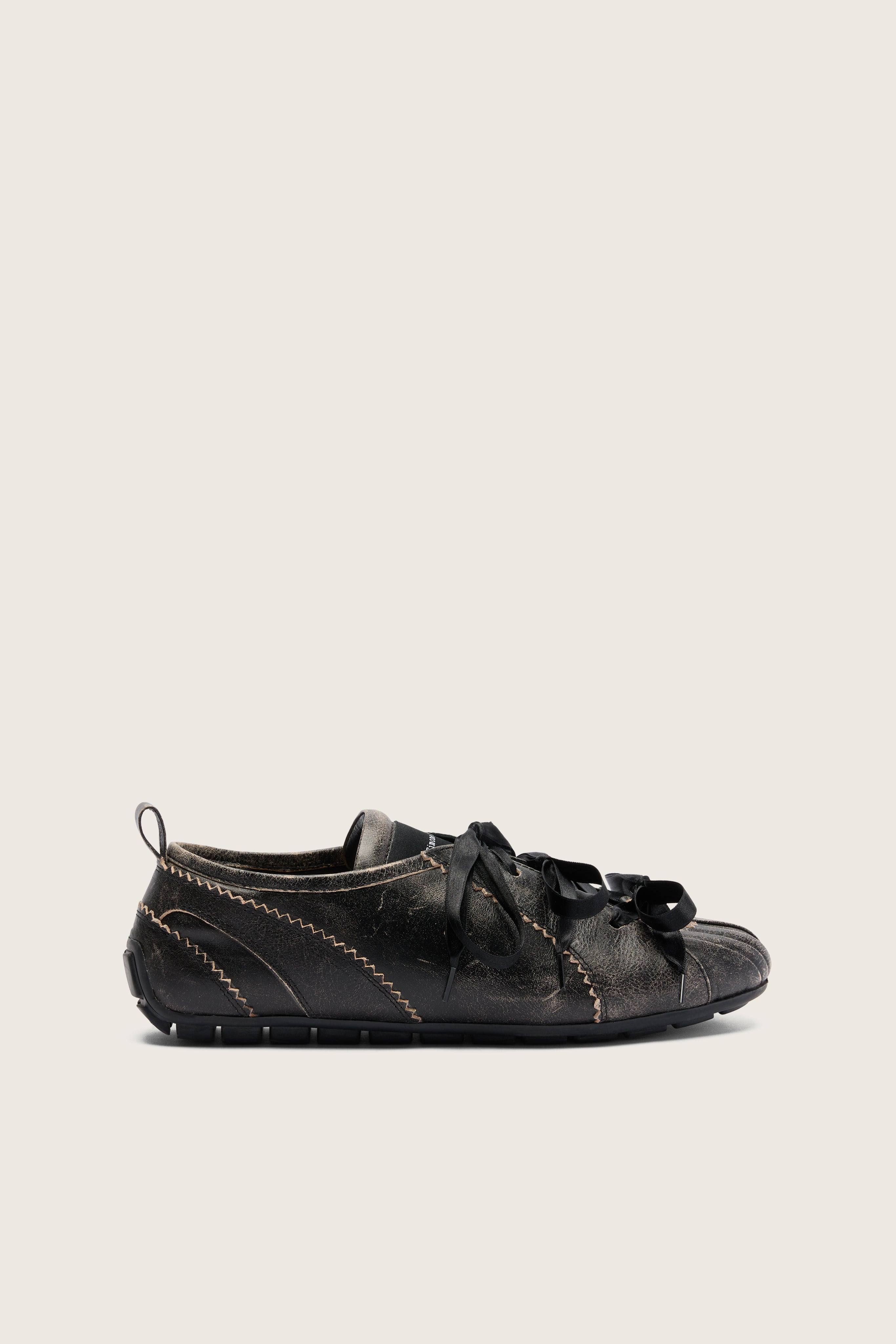 Introducing the Ballerina Grip Trainer, a new take on a ballerina pump with sporty references. It features multiple satin ribbon laces and a branded tongue. This style also comes in women's sizes. Product Details Low-top leather sneakers - Satin bow ribbon lacing - Branded tongue detail - Rubber trek sole Composition: Upper: 100% Leather Lining: 100% Leather Sole: 100% EVA SKU: BPT6-M 0813 DARK BROWN