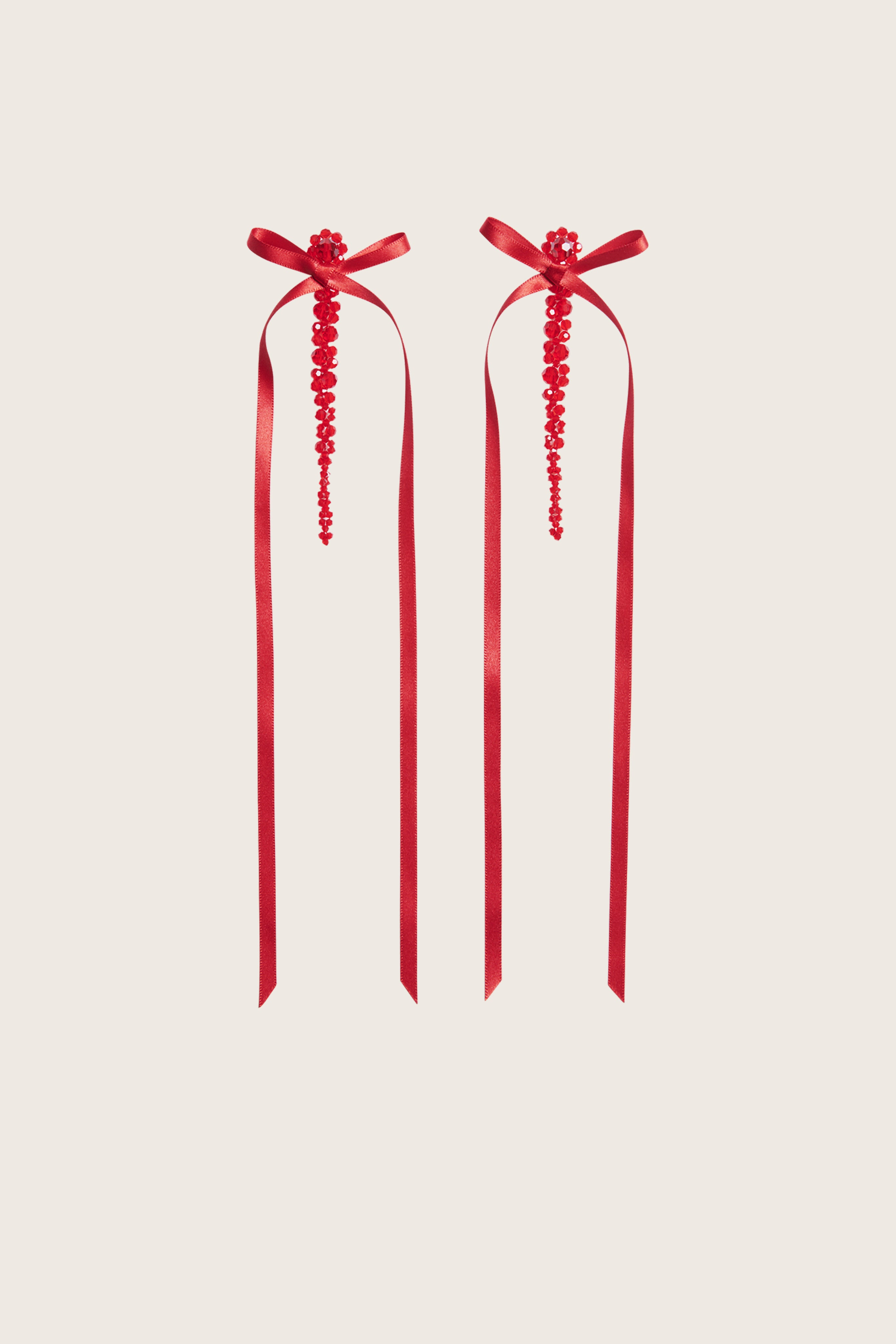 Simone rocha drip earrings in the brand’s signature crystal, taking our classic jewellery style and updating it with a bow ribbon detail. It features a post-stud fastening. Product Details Crystal drop earrings - Ribbon bow detail - Beaded daisy at base - Glass crystal beading Composition: 67% Crystal (Glass), 25% Polyester, 8% Brass SKU: ERG410 0903 RED/RED
