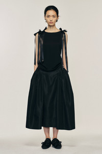 The Bow Ribbon Tail Tank features bow ribbons at the shoulder for a feminine touch, it is designed with a draped loose fit. The model is wearing this style with the Hip Detail Bind Skirt . Product Details Fine jersey tank top - Satin bow detail at shoulder - Shoulder cut out detail - Relaxed fit Composition: Self: 100% Lyocell Trim: 100% Polyester SKU: 5366 0571 BLACK Size & Fit Model is wearing size Extra Small.