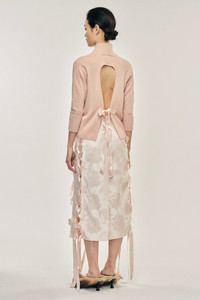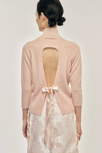 A high neck jumper in a new cashmere yarn, it features a cut out in the back that with a ribbon bow detail. The model is wearing this style with the Unraveling Ribbon Brocade Skirt. Product Details Cashmere cut-out jumper - Cut-out detail at back - Ribbon closure Composition: 100% Cashmere Ribbon: 100% Polyester SKU: COMK1 0667 ROSE Size & Fit Model is wearing size Small.