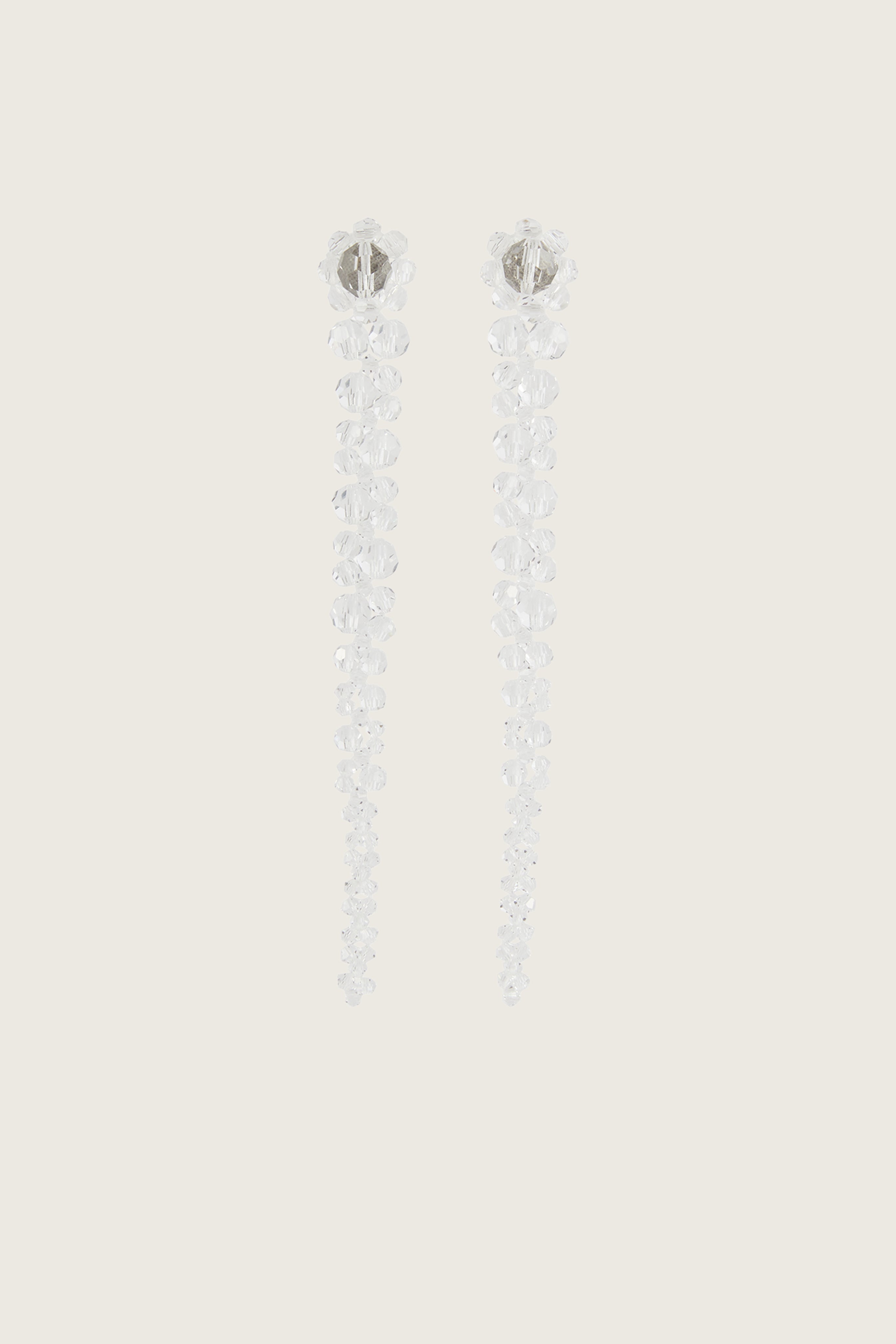 The classic Drip Earrings - floral inspired, crystal beaded drip earrings in classic shades and seasonal colourways. From the beaded flower top of the earring, crystals in decreasing sizes cascade down the "stem" of the drip earrings. Product Details Crystal drop earrings - Beaded daisy at base - Glass crystal beading Composition: 85% Crystal (Glass), 15% Brass SKU: ERG12 0903 CRYSTAL