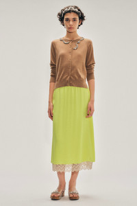 The Lace Trim Negligee Skirt is a new addition to the brand's underpinnings, featuring an elastic waistband and an a-line fit for ease and signature lace trim. Product Details Crepe de chine midi skirt - Elasticated waist - Pockets at side seam - Floral lace trim Composition: SELF: 73%AC 27%SE LINING: 100%CU TRIM: BASE: 100%PA THREAD: 100%PL SKU: 3183 0514 FLUORO