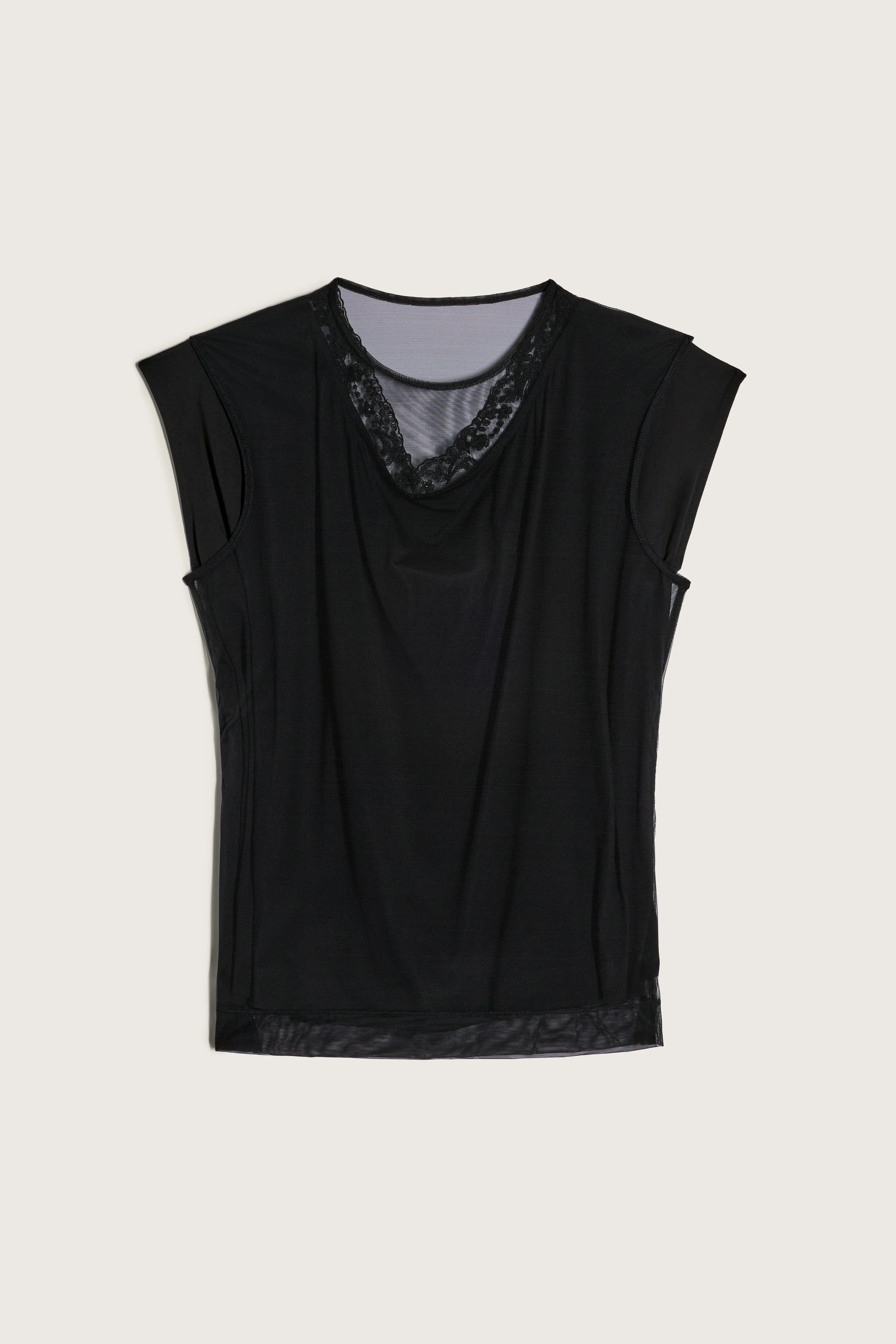 Cap-sleeve tee in cotton jersey with a lace-trimmed neckline and lowered back. The fine ballet tulle overlay adds a softly romantic finish. Product Details Tulle layered cotton jersey t-shirt - Layered construction - Floral lace trim Composition: SELF1: 100%CO / SELF2: 82%PA 18%EA / TRIM: 100% PA THREAD: 100% VI SKU: 5415 0553 BLACK/BLACK