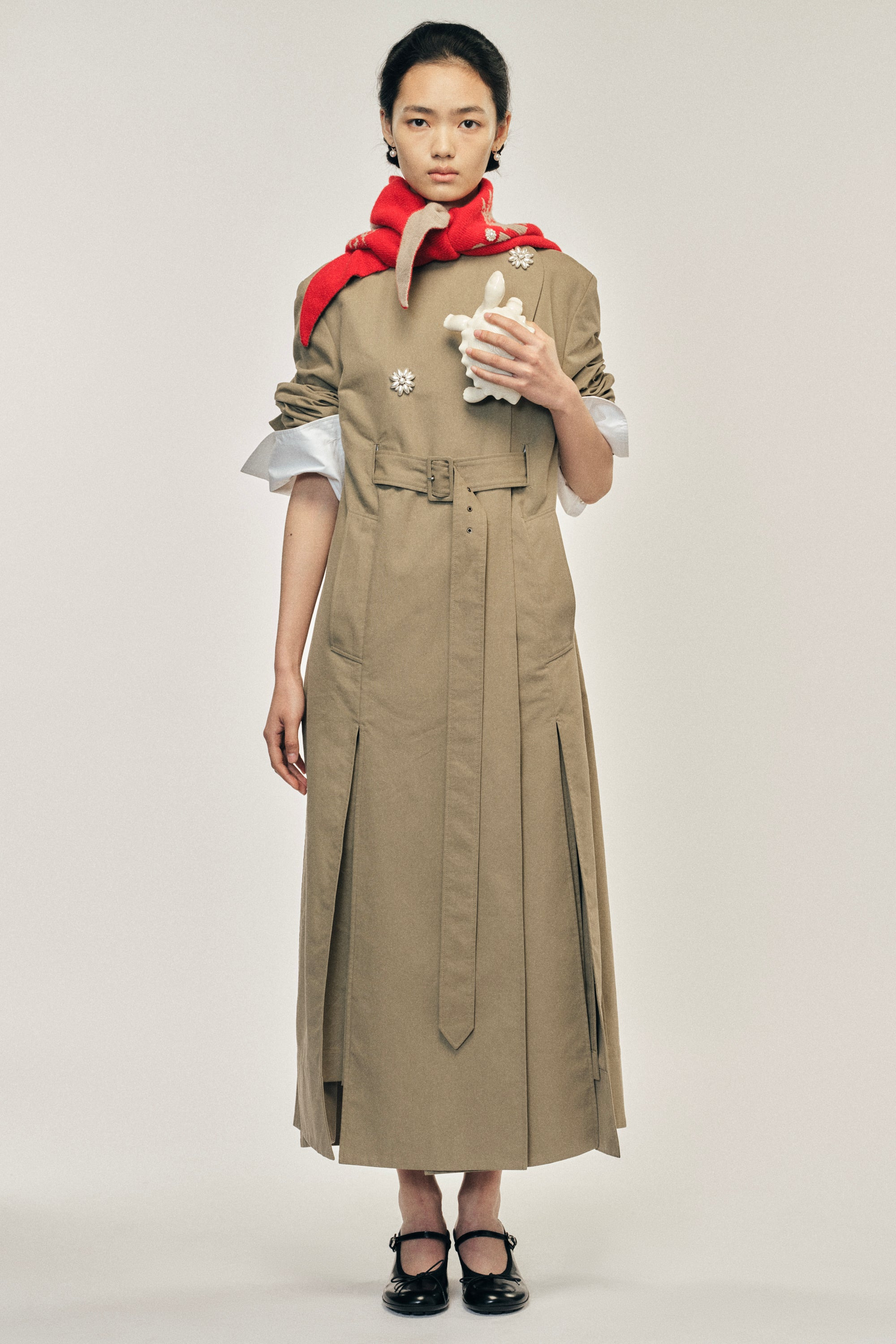 A collarless trench coat featuring slits that have been heavily featured in the collection. The snap flower pearl buttons add a signature touch to the classic trench twill fabrication. Product Details Cotton blend trench coat - From Look 5 on the runway - Faux pearl snap buttons - Welt pockets at side - Seasonal slit detail - Self fabric belt Composition: 70% Cotton 30% Nylon (Excluding Embellishment) SKU: 2075B 1267 STONE/PEARL Size & Fit Model is wearing size 10.
