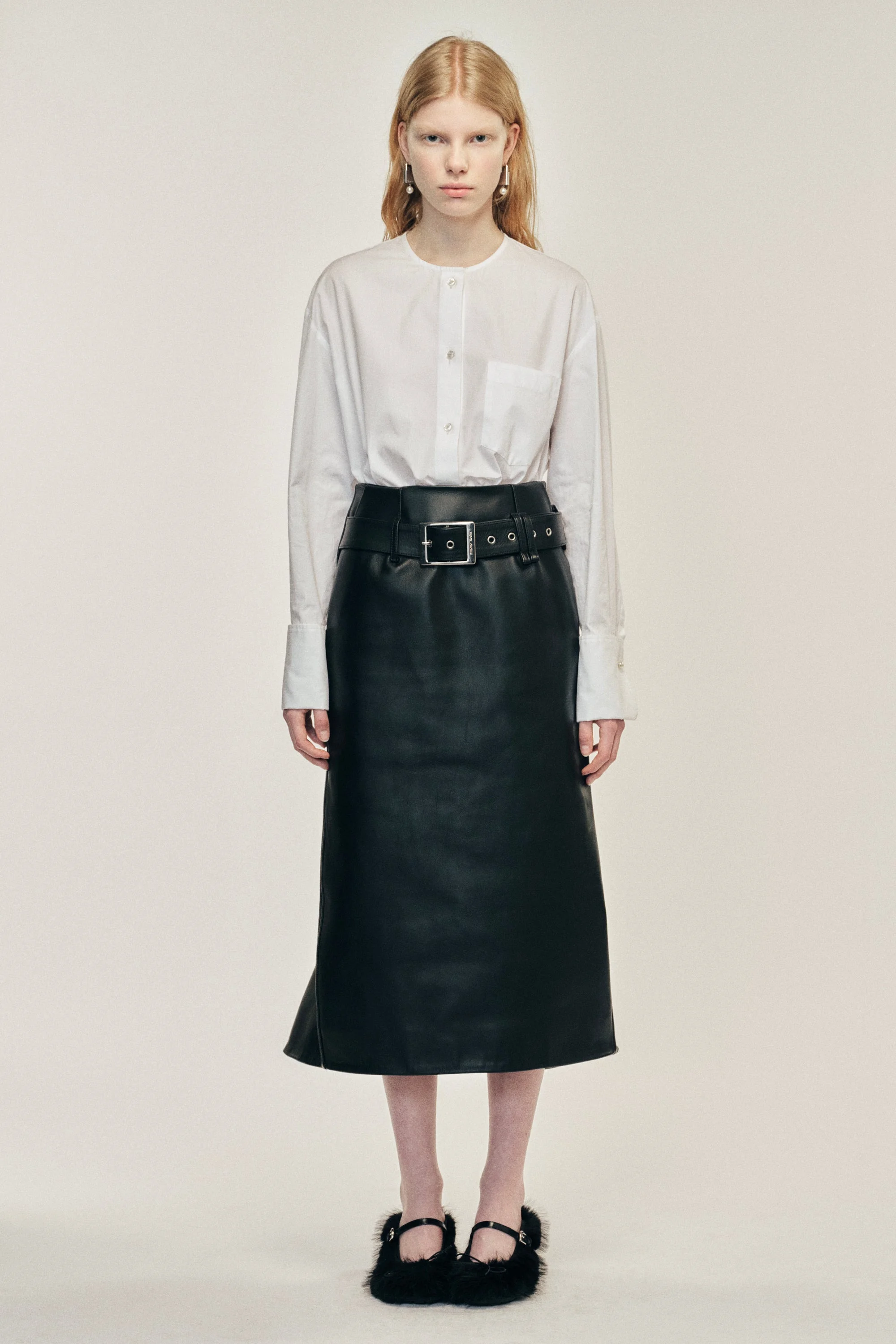 Constructed from a structured leather, the skirt's kick back pleats at the back becomes a focal detail. This features the seasonal double belt loops for a high waisted fit. Product Details Structured leather midi skirt - From Look 1 on the runway - Seasonal double belt loop detail - Kick pleats at back - Zip closure at back - Mid-waist fit Composition: 100% Cow Leather Lining: 100% Viscose SKU: 3164 0457 BLACK Size & Fit Model is wearing size 6.