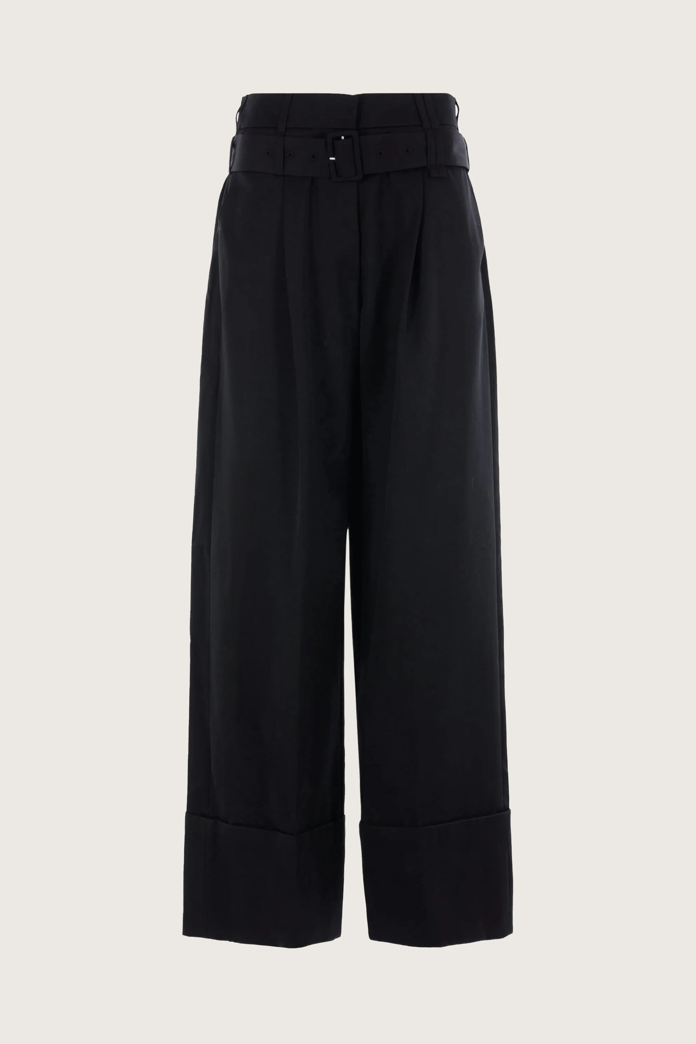 Wide leg high waisted trousers featuring an exaggerated cuffed hem and seasonal double belt loop detail. Tailored from a wool blend with pressed creases along the leg. The model is wearing this style with the Collarless Elongated Cuff Shirt. Product Details Venetian wool wide leg trousers - Seasonal double belt loop detail - Pleats at front - Self-fabric belt - Cuffed turn up hem - High-waist fit Composition: 45% Virgin Wool 55% Polyester Lining: 60% Acetate 40% Cupro SKU: 4155 1217 BLACK Size & Fit Model is wearing size 6.